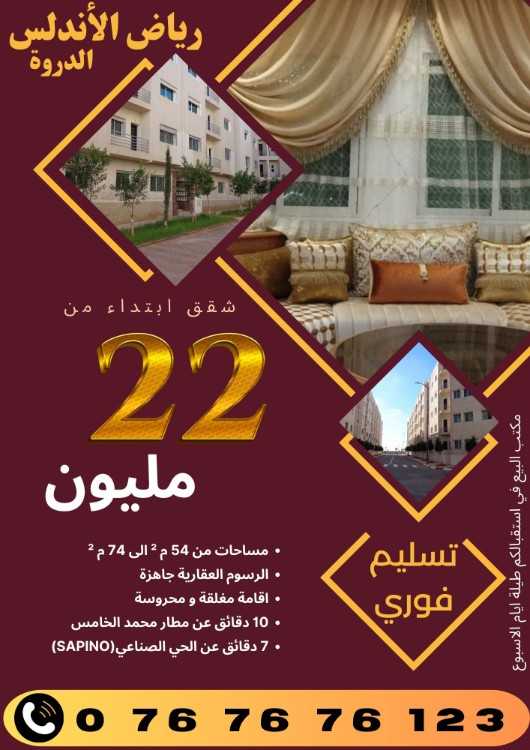 Detail de l’annonce :📍 موقع متميز قريب من كلشي10 دقائق فقط من مطار محمد الخامس ✈️7 دقائق فقط من الحي الصناعي سابينو (SAPINO) 🏭قريبة من المدارس والمرافق الضرورية 🏫🏠 مواصفات الشقق:✔️ غرفتان وصالون واسع 🛋️✔️ من 1 حتى 3 شرفات 🌿✔️ إقامة محروسة 24/7 🔐✔️ رسوم عقارية جاهزة 📜