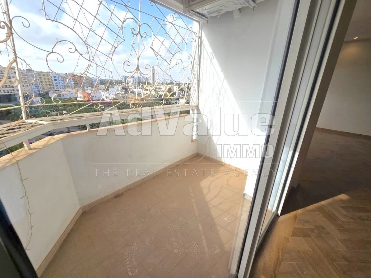 À louer, un bel appartement de 100 m² récemment rénové, situé au 4ème étage d’une résidence propre et sécurisée à Racine, à proximité de Mobilia, avec une vue agréable sur le stade, à Casablanca.